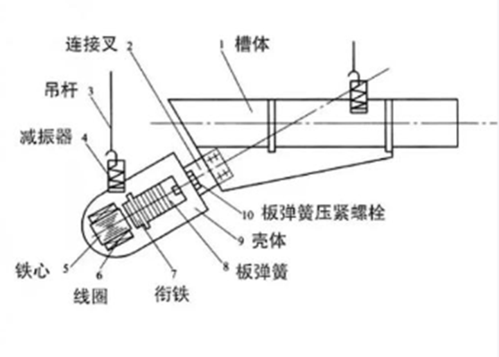 弹性系统是由一组或者多租的弹簧组成,主要是用来将电磁振动器产生的动力传递给料槽。